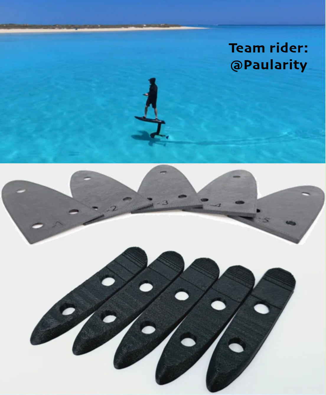 Set of five front and five back "Negative" shims. These shims can help correct the pitch of your Fliteboard ride. Used by many riders for better control of the board by allowing a further back balanced stance over the mast.
